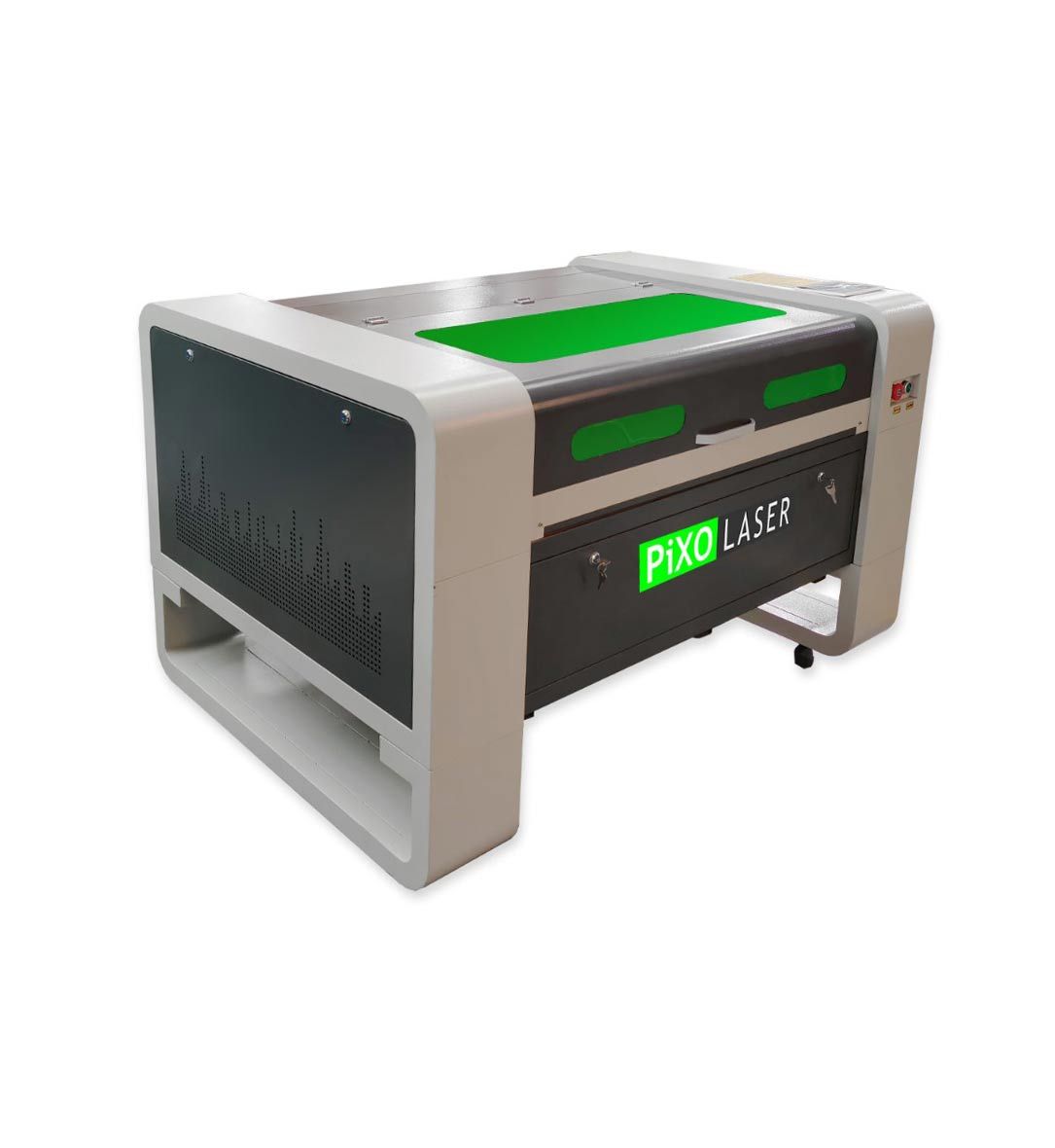 Mobilny system laserowy - Wszystkie systemy laserowe Pixo Laser, wyposażone są w gumowe kółka wraz z blokadą ustawienia, co czyni je wyjątkowo praktycznymi w użyciu pod względem wymaganej powierzchni do ich użytkowania. Solidna konstrukcja zapewniająca dużą sztywność, wysoką dokładność i precyzję. Takie połączenie powoduje, że nasze plotery są mobilne i otrzymują pozytywne opinie klientów. Otwierane drzwi z przodu i z tyłu lasera umożliwiają przelotowe stosowanie bardzo długich materiałów.